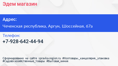 Эдем, магазин по адресу Чеченская республика, Аргун, Шоссейная, 67а в дальнейшем Организация, размещена в следующих категориях: