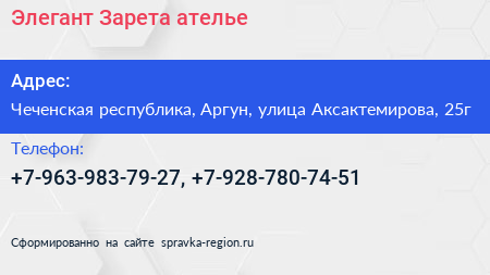 Элегант Зарета, ателье по адресу Чеченская республика, Аргун, улица Аксактемирова, 25г в дальнейшем Организация, размещена в следующих категориях:
