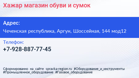 Хажар, магазин обуви и сумок по адресу Чеченская республика, Аргун, Шоссейная, 144 мод12 в дальнейшем Организация, размещена в следующих категориях: