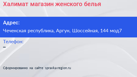 Халимат, магазин женского белья по адресу Чеченская республика, Аргун, Шоссейная, 144 мод7 в дальнейшем Организация, размещена в следующих категориях: