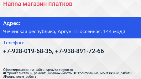 Hanna, магазин платков по адресу Чеченская республика, Аргун, Шоссейная, 144 мод3 в дальнейшем Организация, размещена в следующих категориях: