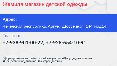 Жамиля, магазин детской одежды по адресу Чеченская республика, Аргун, Шоссейная, 144 мод14 в дальнейшем Организация, размещена в следующих категориях: