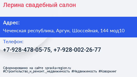 Лерина, свадебный салон по адресу Чеченская республика, Аргун, Шоссейная, 144 мод10 в дальнейшем Организация, размещена в следующих категориях: