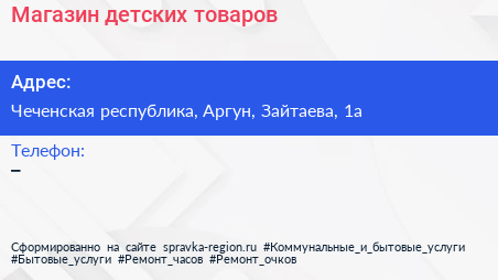 Магазин детских товаров по адресу Чеченская республика, Аргун, Зайтаева, 1а в дальнейшем Организация, размещена в следующих категориях: