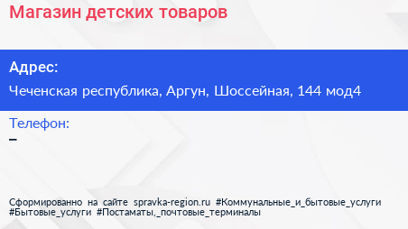 Магазин детских товаров по адресу Чеченская республика, Аргун, Шоссейная, 144 мод4 в дальнейшем Организация, размещена в следующих категориях: