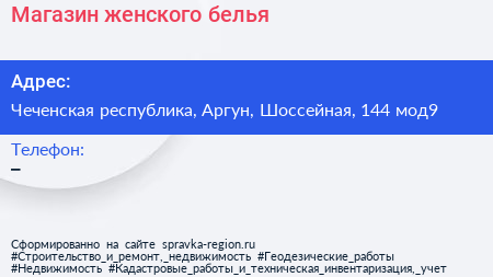Магазин женского белья по адресу Чеченская республика, Аргун, Шоссейная, 144 мод9 в дальнейшем Организация, размещена в следующих категориях: