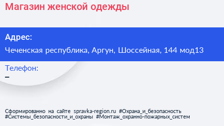 Магазин женской одежды по адресу Чеченская республика, Аргун, Шоссейная, 144 мод13 в дальнейшем Организация, размещена в следующих категориях: