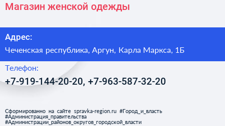 Магазин женской одежды по адресу Чеченская республика, Аргун, Карла Маркса, 1Б в дальнейшем Организация, размещена в следующих категориях: