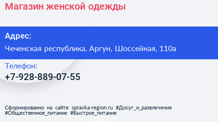 Магазин женской одежды по адресу Чеченская республика, Аргун, Шоссейная, 110а в дальнейшем Организация, размещена в следующих категориях: