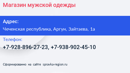 Магазин мужской одежды по адресу Чеченская республика, Аргун, Зайтаева, 1а в дальнейшем Организация, размещена в следующих категориях: