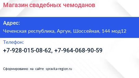 Магазин свадебных чемоданов по адресу Чеченская республика, Аргун, Шоссейная, 144 мод12 в дальнейшем Организация, размещена в следующих категориях: