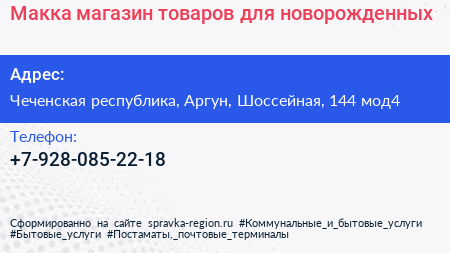 Макка, магазин товаров для новорожденных по адресу Чеченская республика, Аргун, Шоссейная, 144 мод4 в дальнейшем Организация, размещена в следующих категориях:
