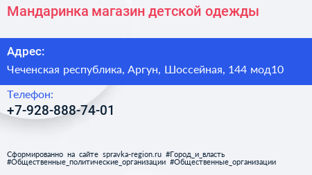 Мандаринка, магазин детской одежды по адресу Чеченская республика, Аргун, Шоссейная, 144 мод10 в дальнейшем Организация, размещена в следующих категориях: