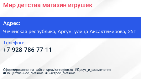 Мир детства, магазин игрушек по адресу Чеченская республика, Аргун, улица Аксактемирова, 25г в дальнейшем Организация, размещена в следующих категориях: