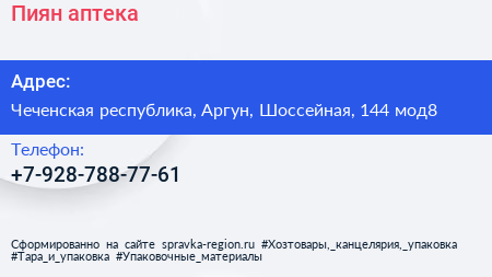 Пиян, аптека по адресу Чеченская республика, Аргун, Шоссейная, 144 мод8 в дальнейшем Организация, размещена в следующих категориях: