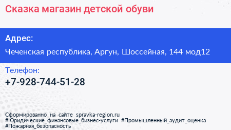 Сказка, магазин детской обуви по адресу Чеченская республика, Аргун, Шоссейная, 144 мод12 в дальнейшем Организация, размещена в следующих категориях: