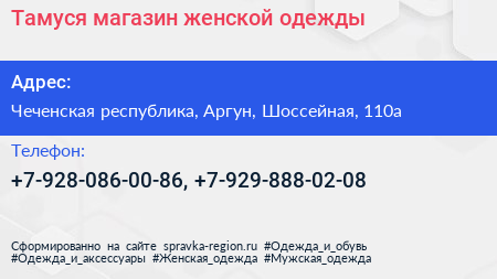 Тамуся, магазин женской одежды по адресу Чеченская республика, Аргун, Шоссейная, 110а в дальнейшем Организация, размещена в следующих категориях:
