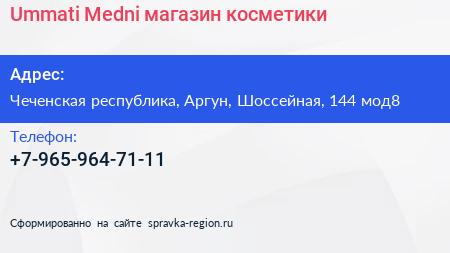 Ummati Medni, магазин косметики по адресу Чеченская республика, Аргун, Шоссейная, 144 мод8 в дальнейшем Организация, размещена в следующих категориях: