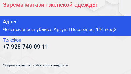 Зарема, магазин женской одежды по адресу Чеченская республика, Аргун, Шоссейная, 144 мод3 в дальнейшем Организация, размещена в следующих категориях: