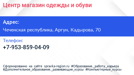 Центр, магазин одежды и обуви по адресу Чеченская республика, Аргун, Кадырова, 70 в дальнейшем Организация, размещена в следующих категориях: