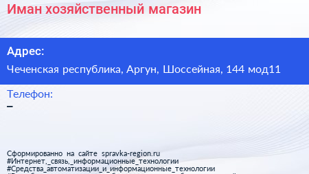 Иман, хозяйственный магазин по адресу Чеченская республика, Аргун, Шоссейная, 144 мод11 в дальнейшем Организация, размещена в следующих категориях: