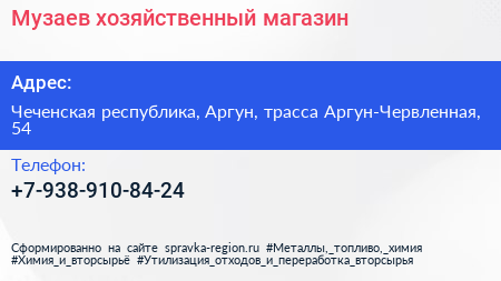 Музаев, хозяйственный магазин по адресу Чеченская республика, Аргун, трасса Аргун-Червленная, 54 в дальнейшем Организация, размещена в следующих категориях: