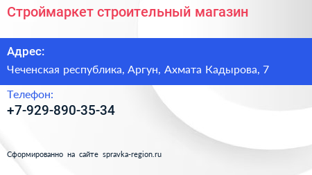 Строймаркет, строительный магазин по адресу Чеченская республика, Аргун, Ахмата Кадырова, 7 в дальнейшем Организация, размещена в следующих категориях:
