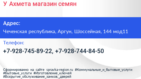 У Ахмета, магазин семян по адресу Чеченская республика, Аргун, Шоссейная, 144 мод11 в дальнейшем Организация, размещена в следующих категориях: