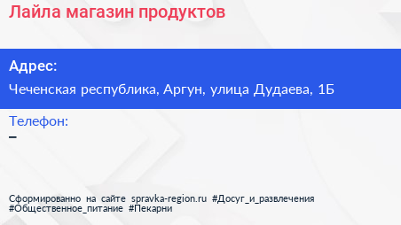 Лайла, магазин продуктов по адресу Чеченская республика, Аргун, улица Дудаева, 1Б в дальнейшем Организация, размещена в следующих категориях: