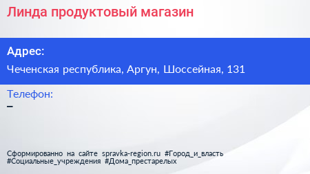 Линда, продуктовый магазин по адресу Чеченская республика, Аргун, Шоссейная, 131 в дальнейшем Организация, размещена в следующих категориях: