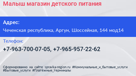 Малыш, магазин детского питания по адресу Чеченская республика, Аргун, Шоссейная, 144 мод14 в дальнейшем Организация, размещена в следующих категориях: