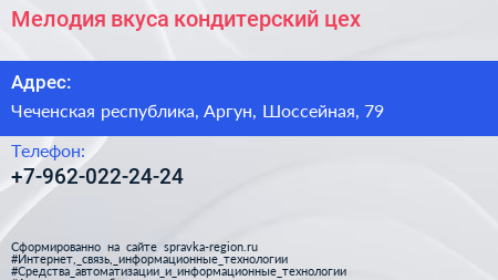 Мелодия вкуса, кондитерский цех по адресу Чеченская республика, Аргун, Шоссейная, 79 в дальнейшем Организация, размещена в следующих категориях: