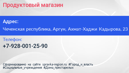 Продуктовый магазин по адресу Чеченская республика, Аргун, Ахмат-Хаджи Кадырова, 23 в дальнейшем Организация, размещена в следующих категориях: