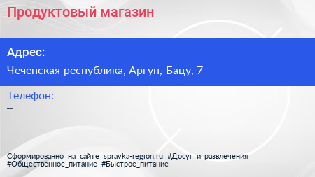 Продуктовый магазин по адресу Чеченская республика, Аргун, Бацу, 7 в дальнейшем Организация, размещена в следующих категориях: