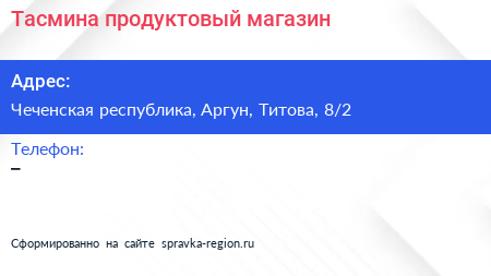 Тасмина, продуктовый магазин по адресу Чеченская республика, Аргун, Титова, 8/2 в дальнейшем Организация, размещена в следующих категориях: