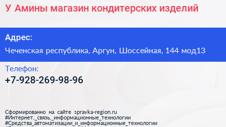 У Амины, магазин кондитерских изделий по адресу Чеченская республика, Аргун, Шоссейная, 144 мод13 в дальнейшем Организация, размещена в следующих категориях:
