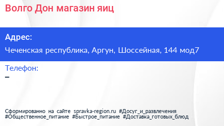 Волго-Дон, магазин яиц по адресу Чеченская республика, Аргун, Шоссейная, 144 мод7 в дальнейшем Организация, размещена в следующих категориях: