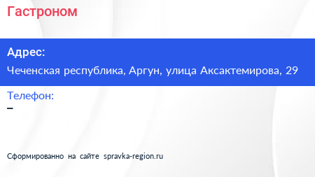 Гастроном по адресу Чеченская республика, Аргун, улица Аксактемирова, 29 в дальнейшем Организация, размещена в следующих категориях: