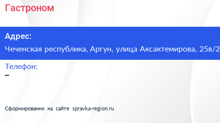 Гастроном по адресу Чеченская республика, Аргун, улица Аксактемирова, 25в/2 в дальнейшем Организация, размещена в следующих категориях:
