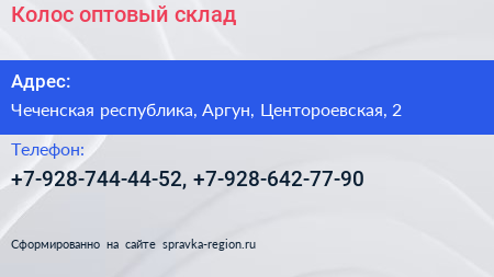 Колос, оптовый склад по адресу Чеченская республика, Аргун, Центороевская, 2 в дальнейшем Организация, размещена в следующих категориях: