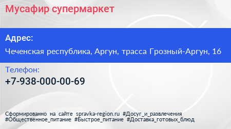 Мусафир, супермаркет по адресу Чеченская республика, Аргун, трасса Грозный-Аргун, 16 в дальнейшем Организация, размещена в следующих категориях: