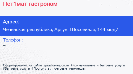 Пет1мат, гастроном по адресу Чеченская республика, Аргун, Шоссейная, 144 мод7 в дальнейшем Организация, размещена в следующих категориях: