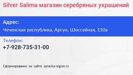 Silver Salima, магазин серебряных украшений по адресу Чеченская республика, Аргун, Шоссейная, 110а в дальнейшем Организация, размещена в следующих категориях: