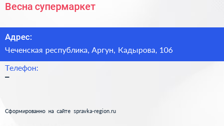 Весна, супермаркет по адресу Чеченская республика, Аргун, Кадырова, 106 в дальнейшем Организация, размещена в следующих категориях: