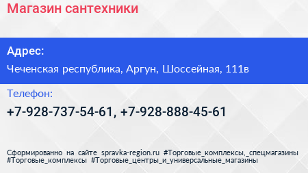 Магазин сантехники по адресу Чеченская республика, Аргун, Шоссейная, 111в в дальнейшем Организация, размещена в следующих категориях:
