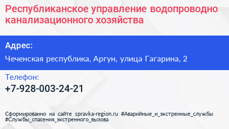 Республиканское управление водопроводно-канализационного хозяйства по адресу Чеченская республика, Аргун, улица Гагарина, 2 в дальнейшем Организация, размещена в следующих категориях: