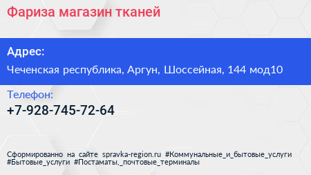 Фариза, магазин тканей по адресу Чеченская республика, Аргун, Шоссейная, 144 мод10 в дальнейшем Организация, размещена в следующих категориях: