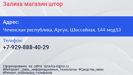 Залиха, магазин штор по адресу Чеченская республика, Аргун, Шоссейная, 144 мод13 в дальнейшем Организация, размещена в следующих категориях: