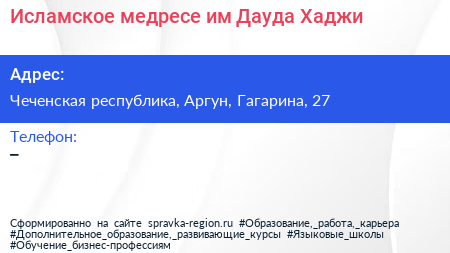 Исламское медресе им. Дауда-Хаджи по адресу Чеченская республика, Аргун, Гагарина, 27 в дальнейшем Организация, размещена в следующих категориях: