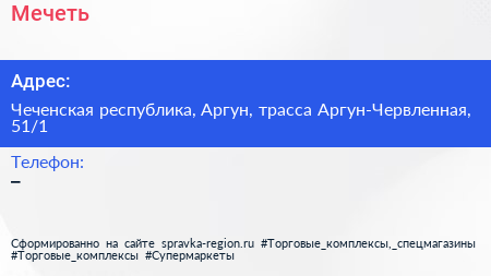Мечеть по адресу Чеченская республика, Аргун, трасса Аргун-Червленная, 51/1 в дальнейшем Организация, размещена в следующих категориях: